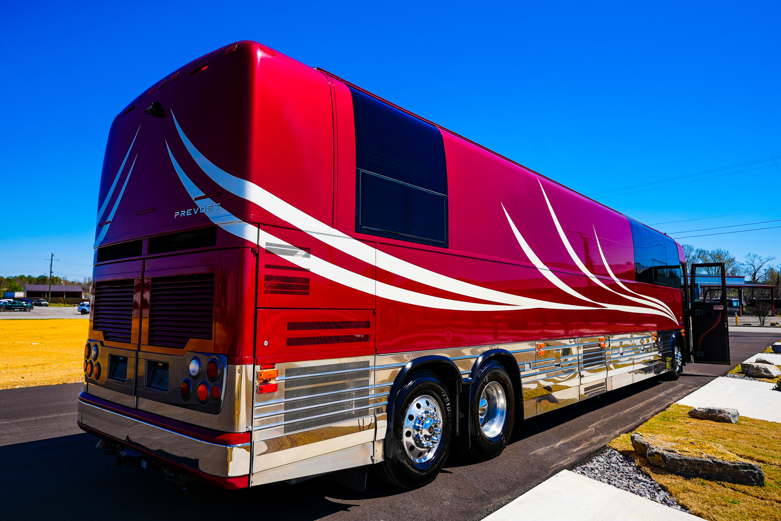 Presley is a Prevost XLII entertainer coach. With a fully renovated interior in 2024, this coach contains 12 bunks and is a single slide-out model with a Star Coach conversion option. This bus is equipped with two televisions in the front lounge, one television in the rear lounge, full size refrigerator, microwave, stocked kitchen and linens, two bathrooms, single shower, a condo bunk conversion option and / or twin size bed kit in the rear lounge.