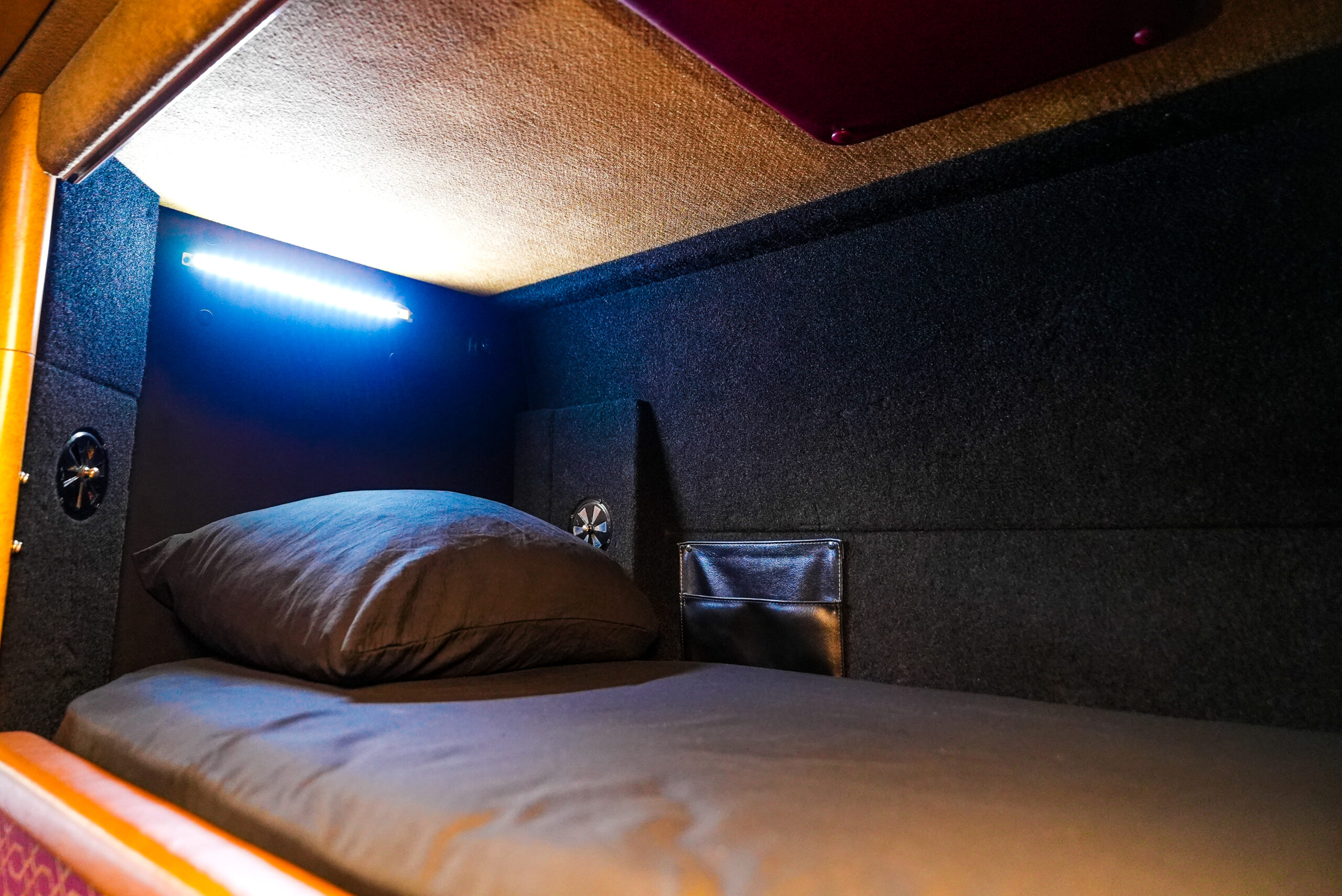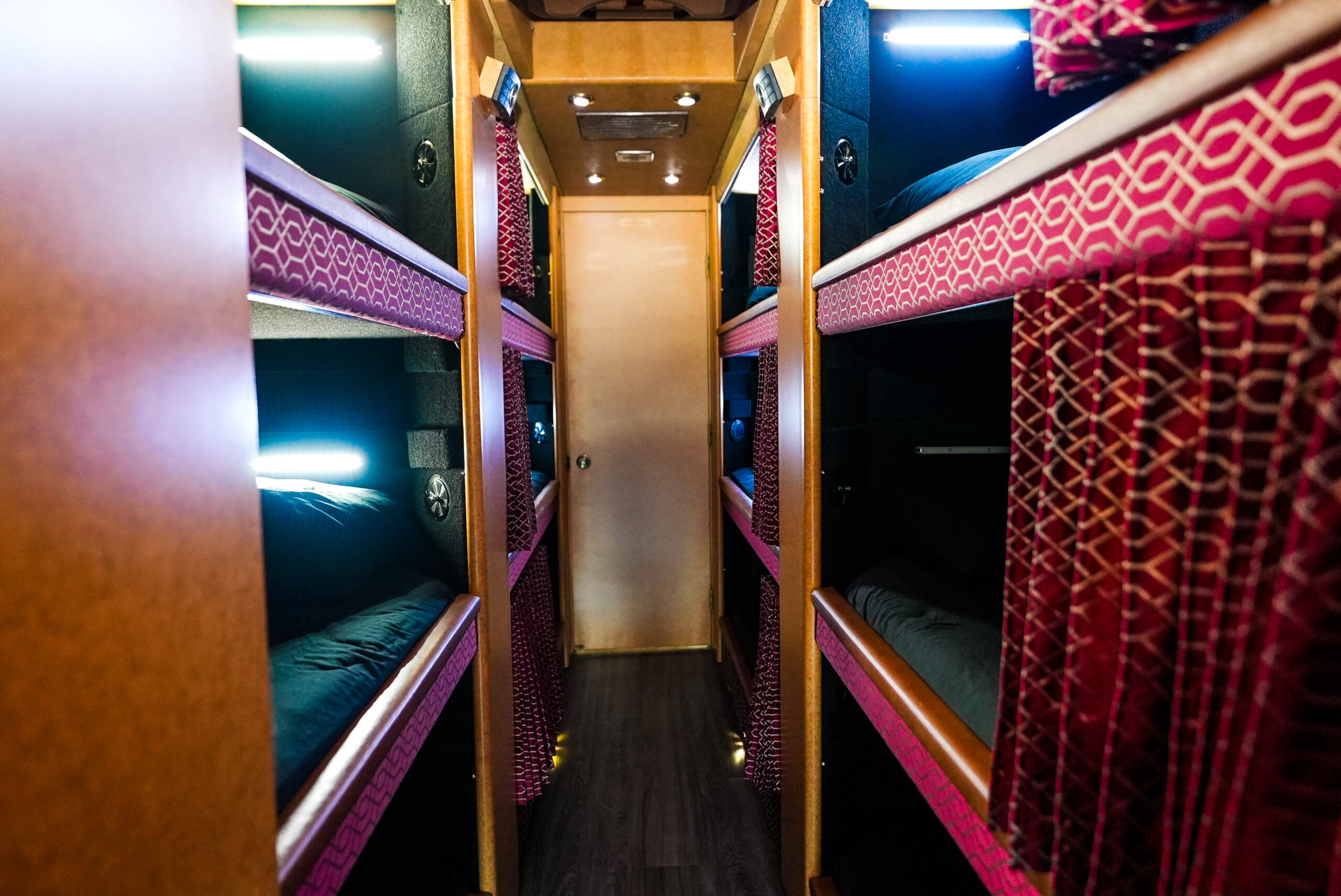 Bluey is a PrevostXLII entertainer coach. Contains a newly renovated interior including 12 bunks with new memory foam gel mattresses, and is equipped with three televisions, two new undercounter refrigerator/freezers, microwave, stocked kitchen and linens, bathroom with no shower, and optional back lounge twin or full size bed kit.