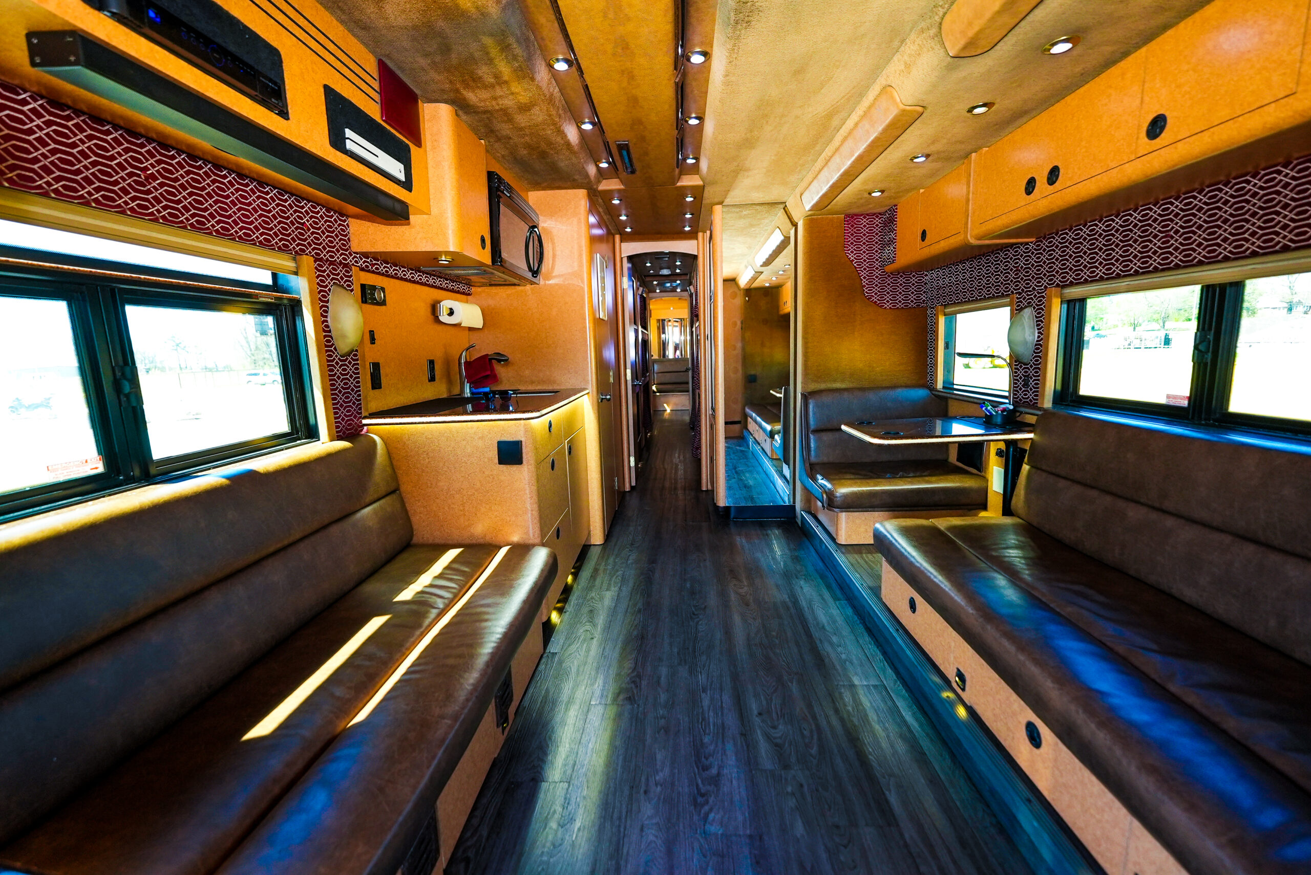 Benson is a PrevostXLII entertainer coach. Contains 12 bunks and is a single slide-out model with two bathrooms and a shower with a Star Coach conversion option. The coach is equipped with two televisions, a full size refrigerator/freezer, microwave, stocked kitchen and linens, and optional back lounge twin size bed kit.